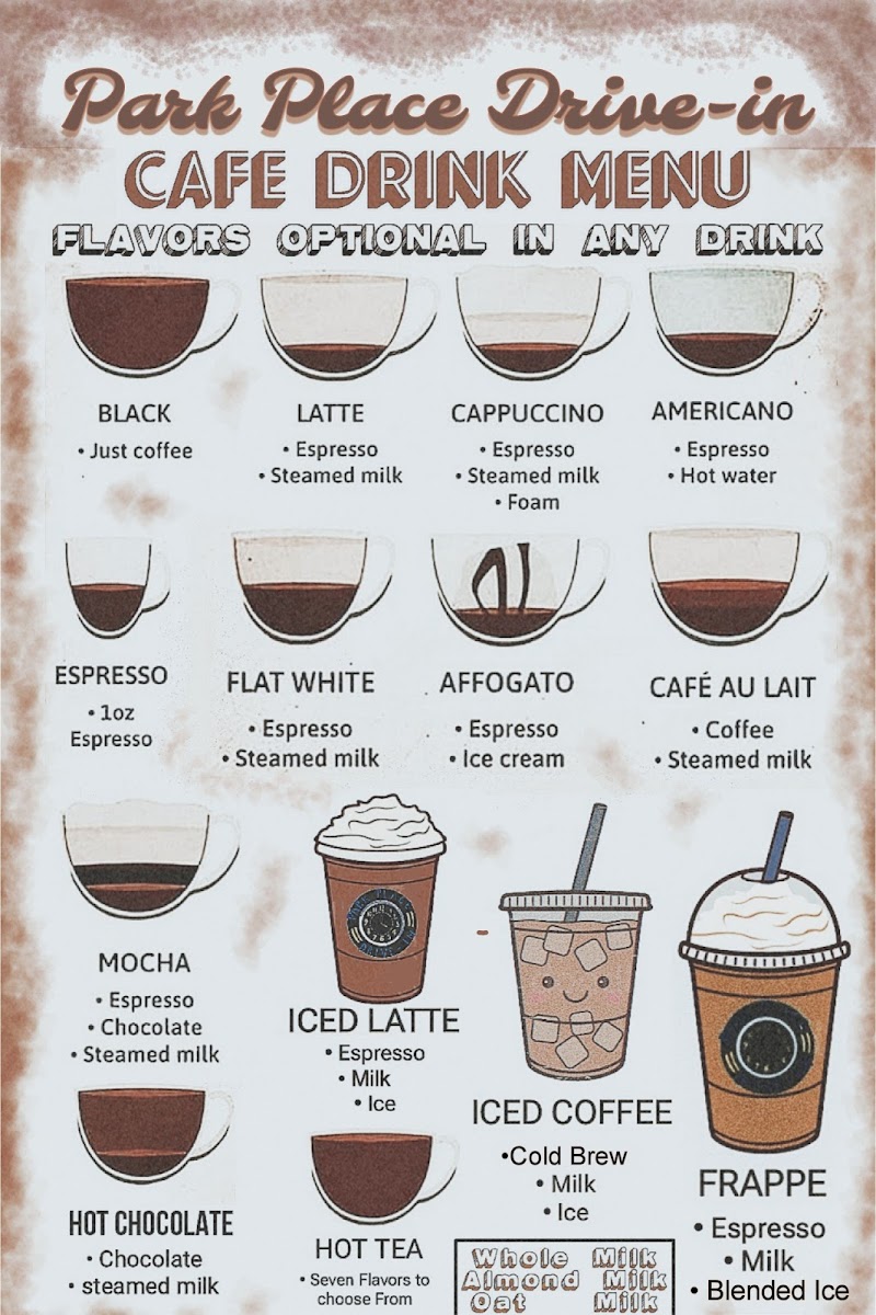 Choice of flavors including chocolate variants, vanilla, nutty, and more. Sizes available: 12oz, 16oz, 20oz. Option for whipped topping.