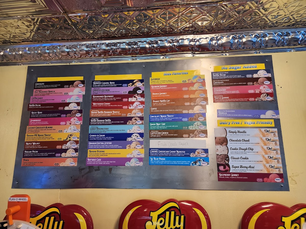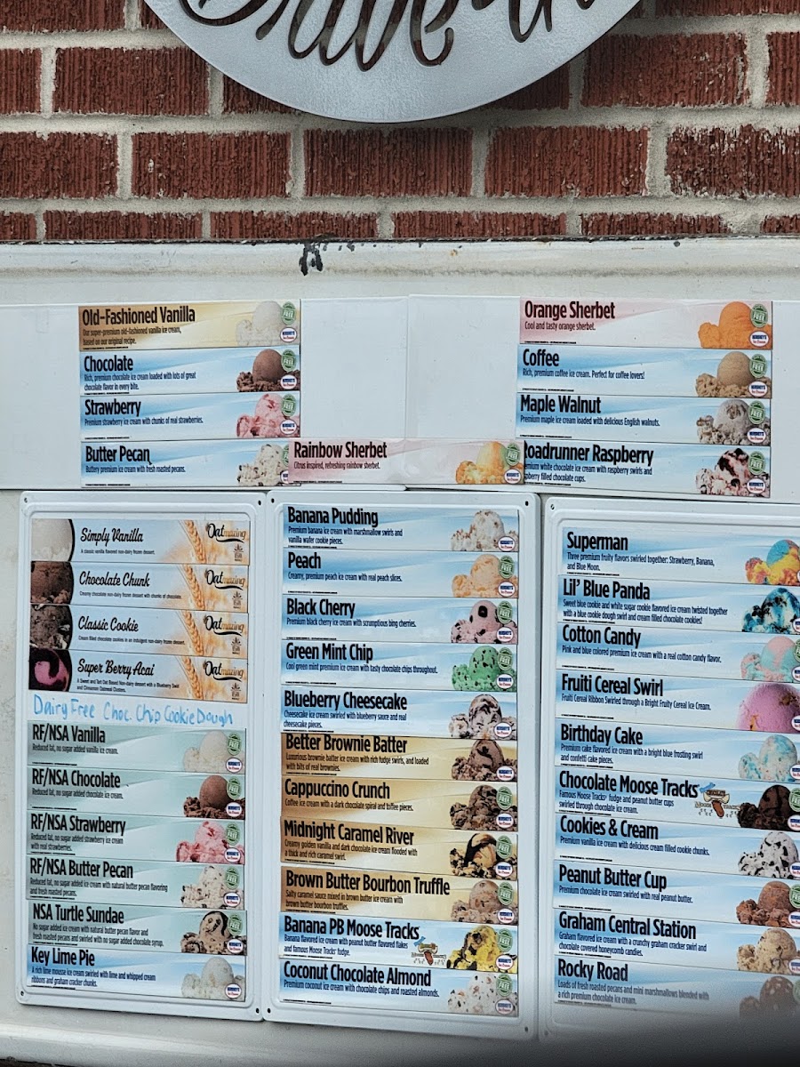 Quarts of dairy-free options available including vanilla, super berry acai, and chocolate chunk. Sugar-reduced varieties like butter pecan and turtle sundae. Classics and unique blends like birthday cake, brown butter bourbon truffle, and cotton candy.